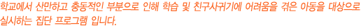 | ÁÖ 1ȸ 60ºÐ°£ 14ÁÖ·Î ÁøÇàµÇ¸ç ADHD ¾Æµ¿ÀÇ ÀÎÁöÀû, ÇൿÀû Ãæµ¿¼ºÀ» °¨¼Ò½Ã۰í Á¦ÇÑµÈ ½Ã°£ µ¿¾È¿¡ ÁÖ¾îÁø °úÁ¦¸¦ Àß ¼öÇàÇÒ ¼ö ÀÖµµ·Ï µ½´Â ³»¿ëÀ¸·Î 6ȸ°¡ ÁøÇàµÇ°í, ADHD ¾Æµ¿ÀÌ °¢°¢ÀÇ »óȲ(Çб³, ¶Ç·¡ °ü°è, °¡Á¤)¿¡¼ ÀڽŰú ŸÀÎÀÇ °¨Á¤À» ÀνÄÇÏ°í °ø°¨ÇÏ¿© ¹Ù¶÷Á÷ÇÑ ¹æ¹ýÀ¸·Î ´ëóÇϰųª °ü°è¸¦ ¸ÎÀ» ¼ö ÀÖ´Â Social Skill ÁõÁøÀ» µ½´Â ³»¿ëÀ¸·Î 8ȸ°¡ ÁøÇàµË´Ï´Ù.